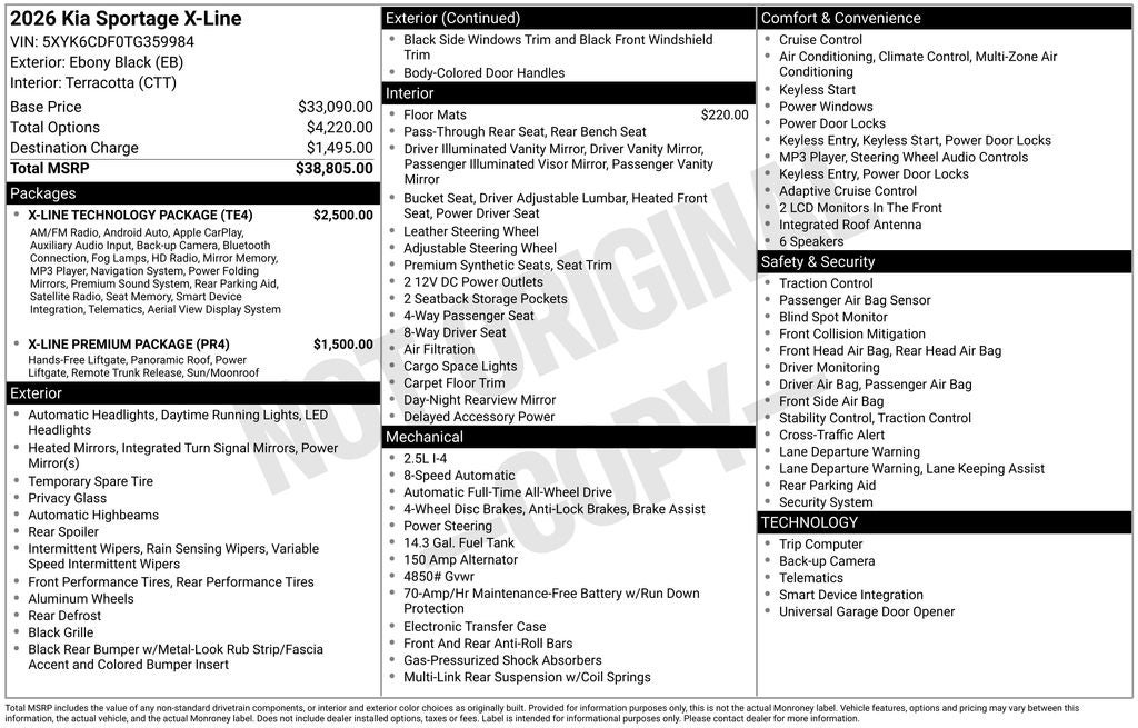 Sale Price Includes Financing with Lupient KIA. Price excludes Tax, Title, License, Service Fee and any Dealer installed accessories. Manufacturer Suggested Retail Price may not represent actual sale price. Price includes: $2000 - KFA Dealer Choice Program: $2000 discount. $30.08 per $1000 financed. Available to well qualified buyers who finance through Kia Finance America. 506. Exp. 03/02/2026